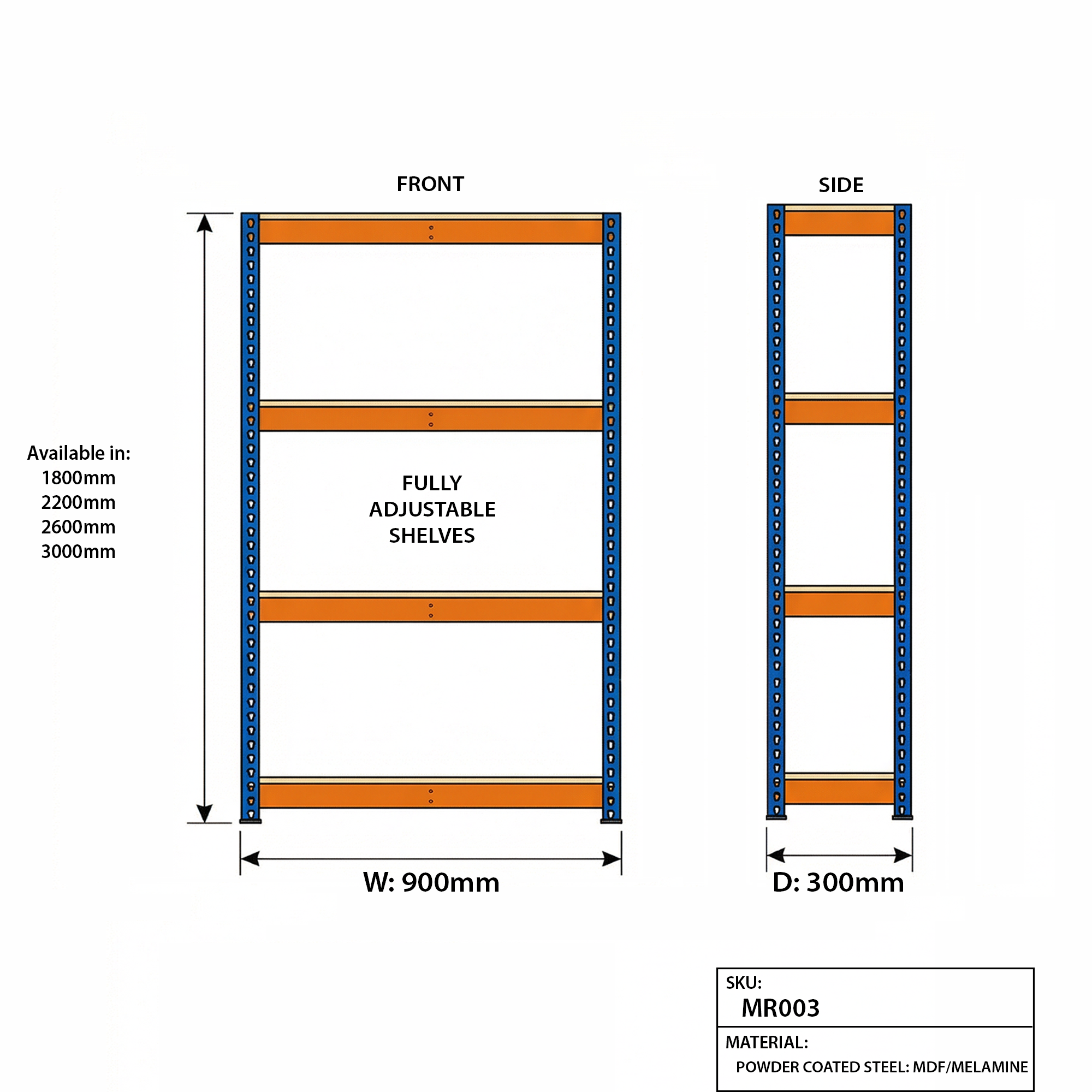 Présentation de MR00360Étagère robuste en LConçu pour offrir un rangement robuste et polyvalent, ce meuble se distingue par sa construction élégante et durable. 1800 mm de hauteur, 900 mm de large, et 600mm de profondeurce qui le rend idéal pour les garages, les ateliers ou les buanderies où l'espace et l'organisation sont importants.