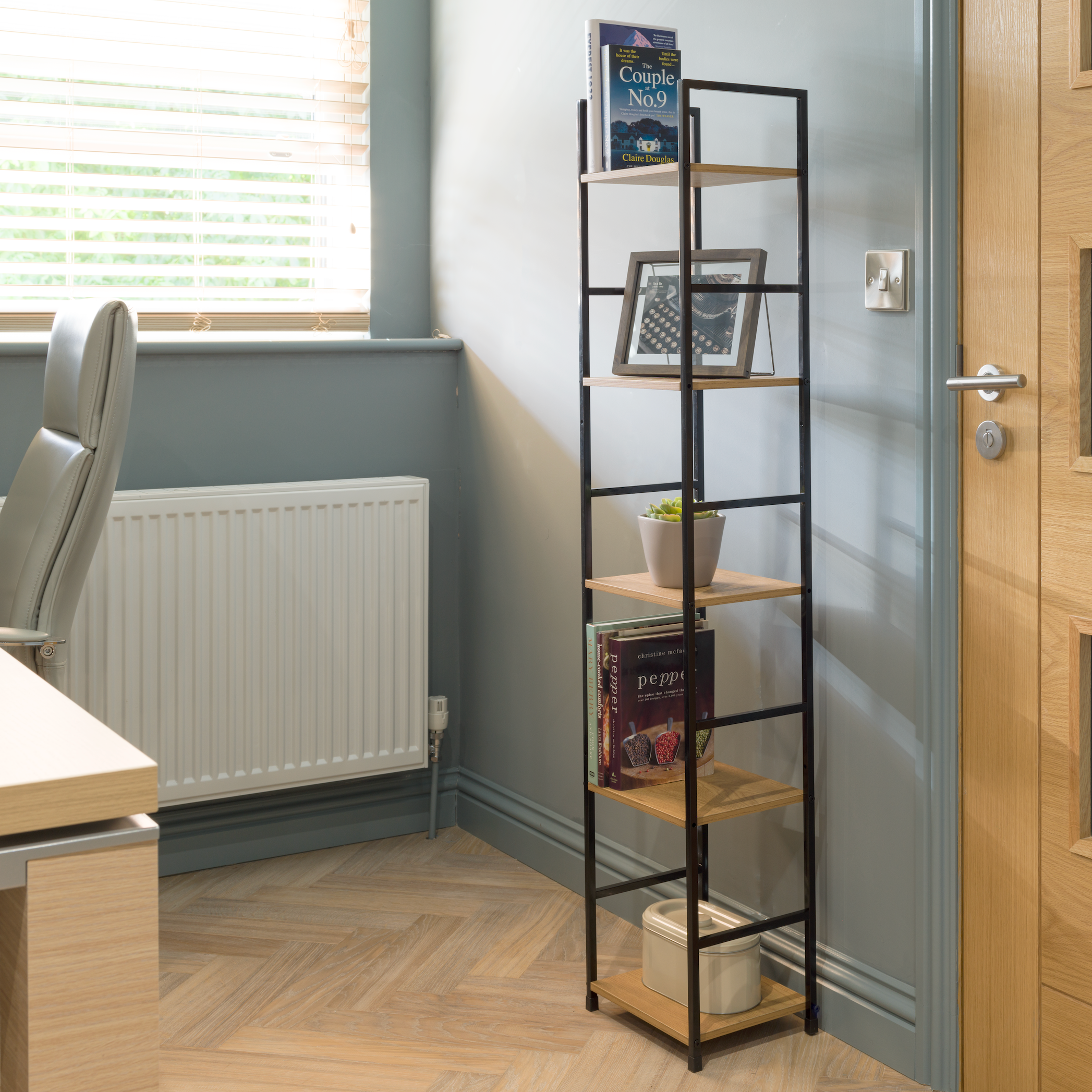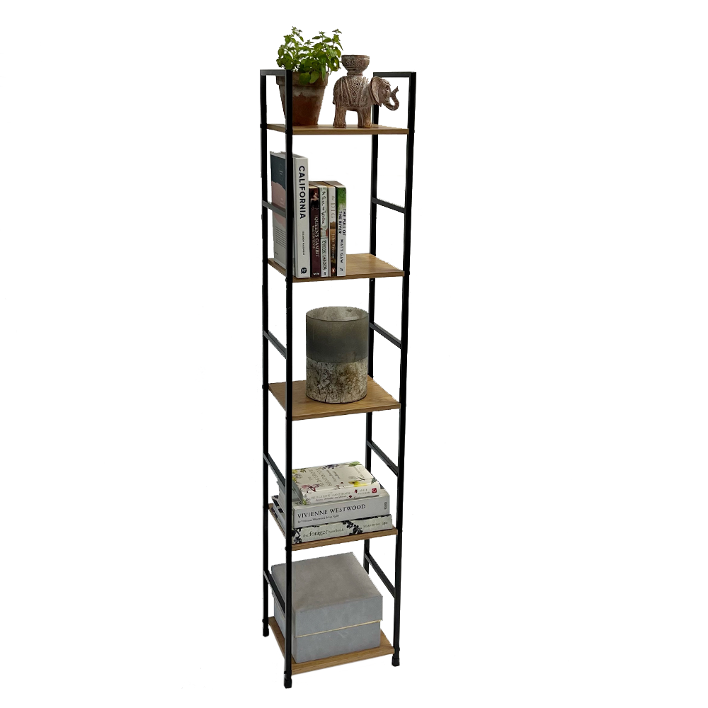 This stylish bookshelf features five oak effect shelves supported by a sleek black ladder style frame, making it a versatile addition to any room, Whether used as home office storage, a display stand or bookshelf – this unit also pairs well with other units from our range. This shelving unit complements any interior décor.