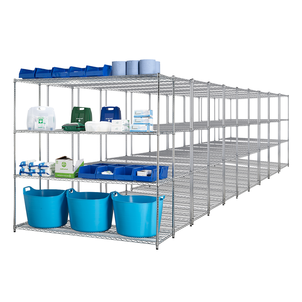 Ideal for applications in food processing, hospitals, dental surgeries, schools, catering, retail stores, and horticulture, our chrome wire shelving offers a practical and efficient solution for all your storage requirements.